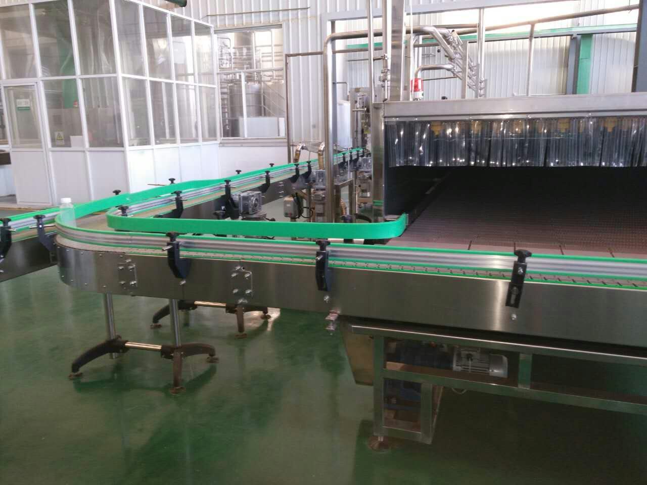 本機是為熱灌裝生產(chǎn)線后期瓶蓋消毒而設計的專用設備。它是以電機減速機通過鏈輪帶動特殊的輸送鏈,使包裝容器在輸送中實現(xiàn)在線倒瓶,達到工藝要求的消毒時間,再自動直立,從而實現(xiàn)從倒瓶到殺菌再到直立的過程。根據(jù)客戶的需要,可進行直道倒瓶和彎道倒瓶的設計,并可根據(jù)客戶要求的生產(chǎn)線產(chǎn)量或殺菌時間進行殺菌機的特殊設計及電機功率配置。