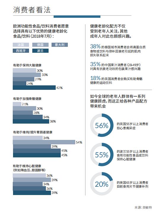 2019年,健康老齡化將為食品和飲料行業(yè)發(fā)展帶來機遇。消費者將健康生活視為一種全面、積極、不懈的追求,因此,他們正為更長壽、更健康的人生做著相應準備。消費者將注重健康生活視為“關愛自身”這一理念的重要延續(xù),這是英敏特2018年全球食品和飲料趨勢“關愛自我”中明確的一種習慣。
