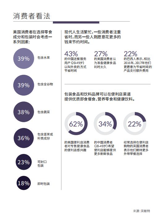 如今的大環(huán)境下,消費者日漸重視健康飲食、尋求創(chuàng)意口味、對個性化產品興趣濃厚,并且快遞服務競爭不斷升級。制造商正努力應對這些全新的需求,新一代便利食品和飲料正在興起。消費者 傾向于選擇優(yōu)質產品,他們對更 自然、營養(yǎng)或定制產品的需求大大提升,這些產品可滿足消費者繁忙日常生活的需要,無需犧牲自己的健康目標,或對新產品成分、口味、形式的好奇心。